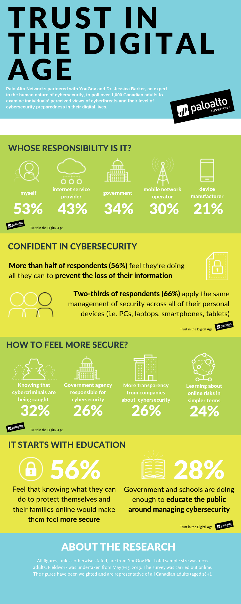 TORONTO, July 9, 2019 – A new online survey from Palo Alto Networks (NYSE: PANW), the global cybersecurity leader, and YouGov reveals that two-thirds of Canadians (66%) apply the same management of security across all of their personal devices (e.g., PCs, laptops, smartphones, tablets), and more than half of respondents (56%) feel they’re doing all they can to prevent the loss of their information.