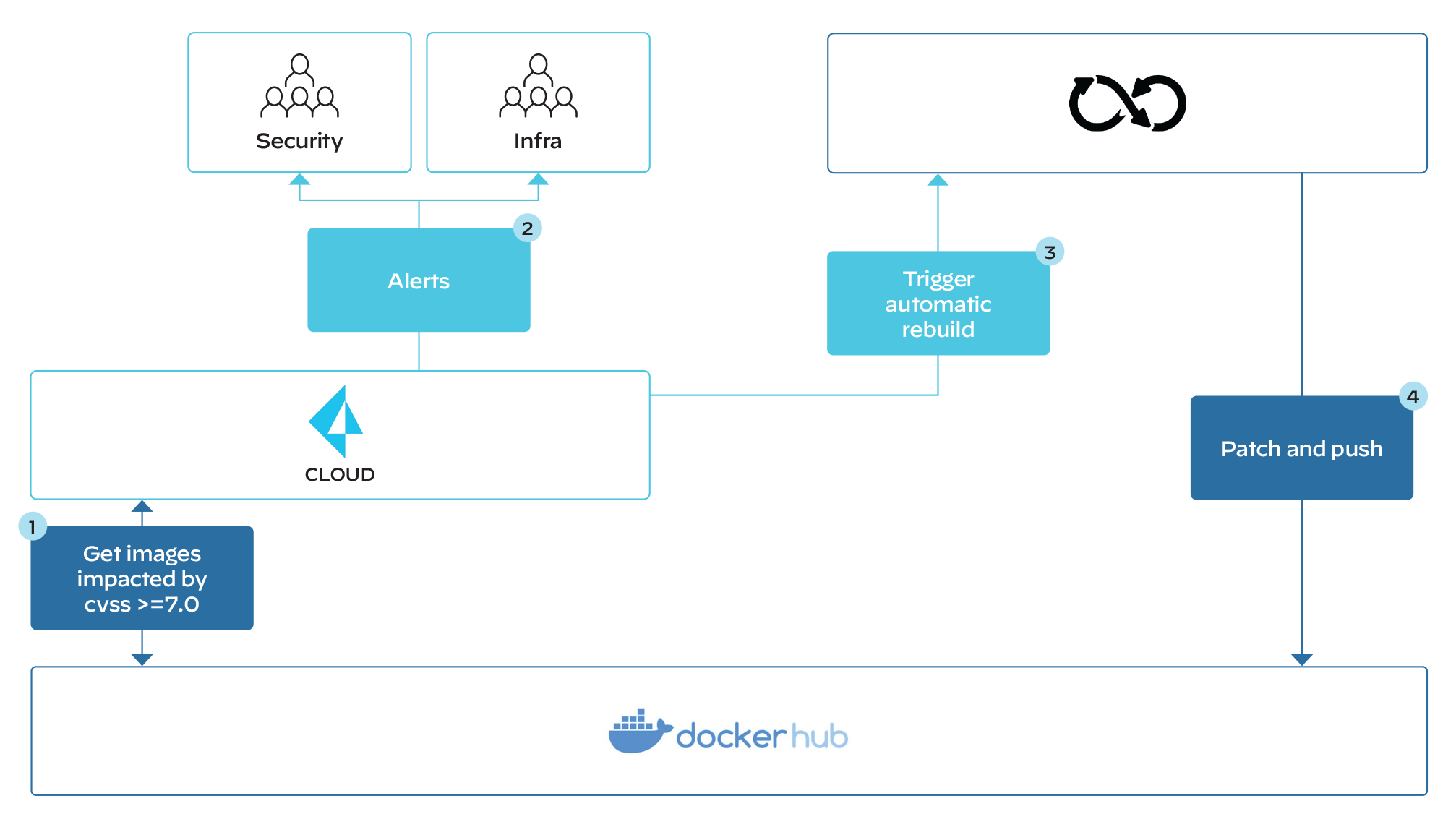 Prisma Cloud scans all base images in Docker (1). If an image scores higher than seven on the Common Vulnerability Scoring System (CVSS), the security and infrastructure team members are alerted (2). At the same time, Prisma Cloud is configured to trigger an automated rebuild (3) in the CircleCI CI/CD solution, which subsequently updates (patches) the base images and pushes them into the Docker registry (4). Prisma Cloud currently detects 1-2 image vulnerabilities each week.