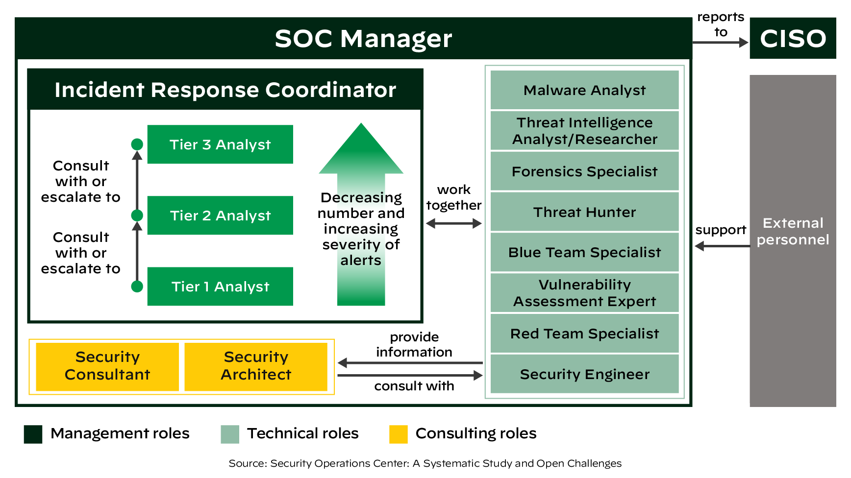 Typical core roles that make up a SOC team consist of different tiers of SOC analysts and dedicated managers. In their research, Manfred Vielberth, Fabian Böhm, Ines Fichtinger and Günther Pernul identify these main roles — each with a specific skill set — in a SOC team.