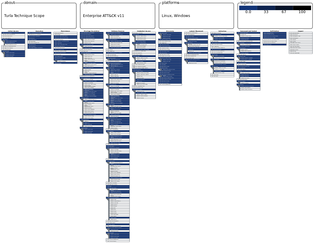 Caption: The MITRE ATT&CK framework: Turla. Explore in ATT&CK Navigator. Note: The items in blue are the techniques in the MITRE ATT&CK Enterprise framework that were emulated.