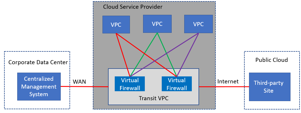 A transit VPC uses a hub-and-spoke architecture in which each spoke VPC is attached to the hub transit VPC via an IPsec tunnel. For redundancy, the transit VPC contains twin virtual firewalls cross-connected to each VPC (see figure 1). The virtual firewalls inspect traffic based on local policies (e.g., only users in the IT domain can initiate FTP transfers or start remote terminal sessions). Network administrators can manage policies for the virtual firewalls from a centralized management system, avoiding the need for multiple consoles.