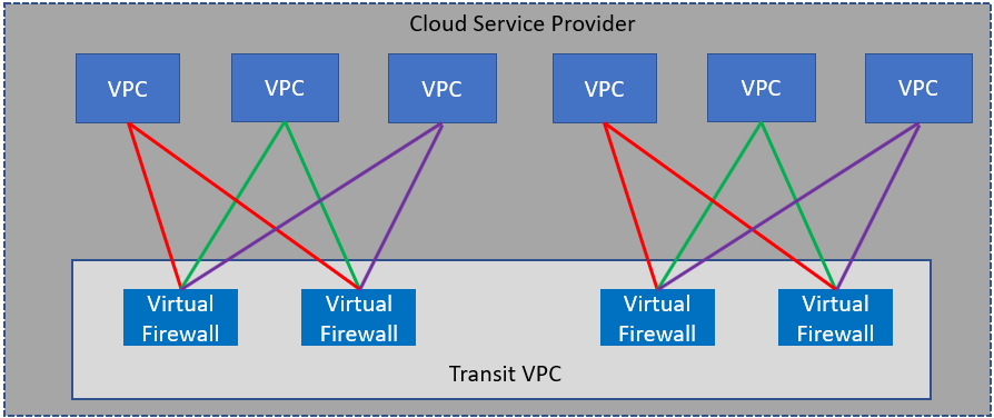 Transit VPCs avoid the scaling problems associated with full-mesh architecture, in which the number of interconnections grows exponentially as VPCs are added. In a transit VPC architecture, each VPC requires just two connections, so the number of connections increases linearly. Virtual firewalls have a finite number of possible connections, but additional firewalls can be added as needed (see figure 2).