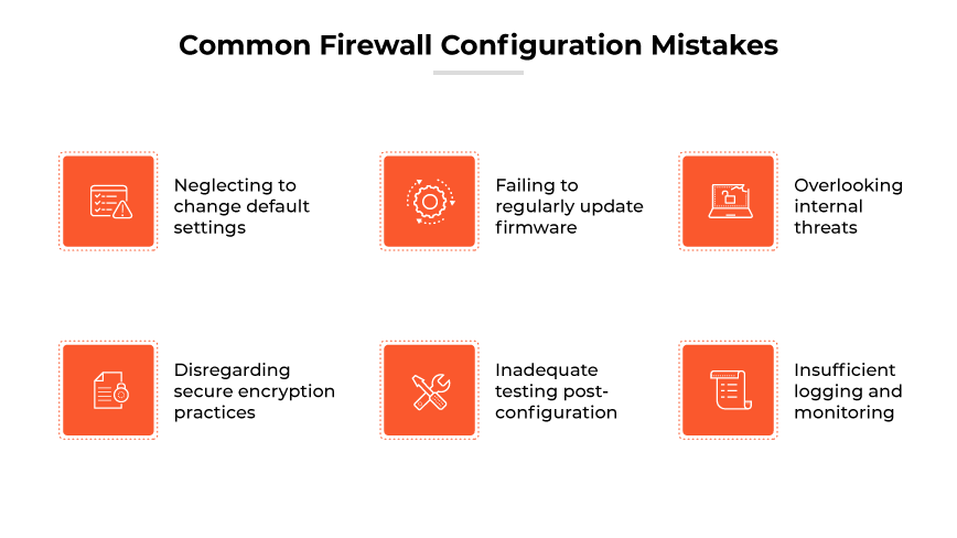 Alt text: FW configuration mistakes: default settings, outdated firmware, internal threats, discounting encryption, inadequate testing & logging