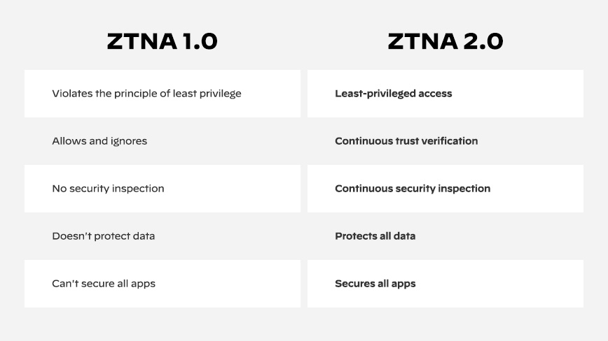- Do not provide security inspection. ZTNA 1.0 solutions assume all allowed traffic is free from malware and other threats or vulnerabilities as they have no ability to detect or prevent malware or lateral movement across connections.