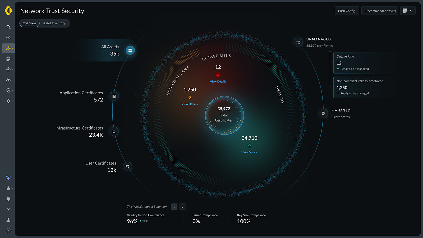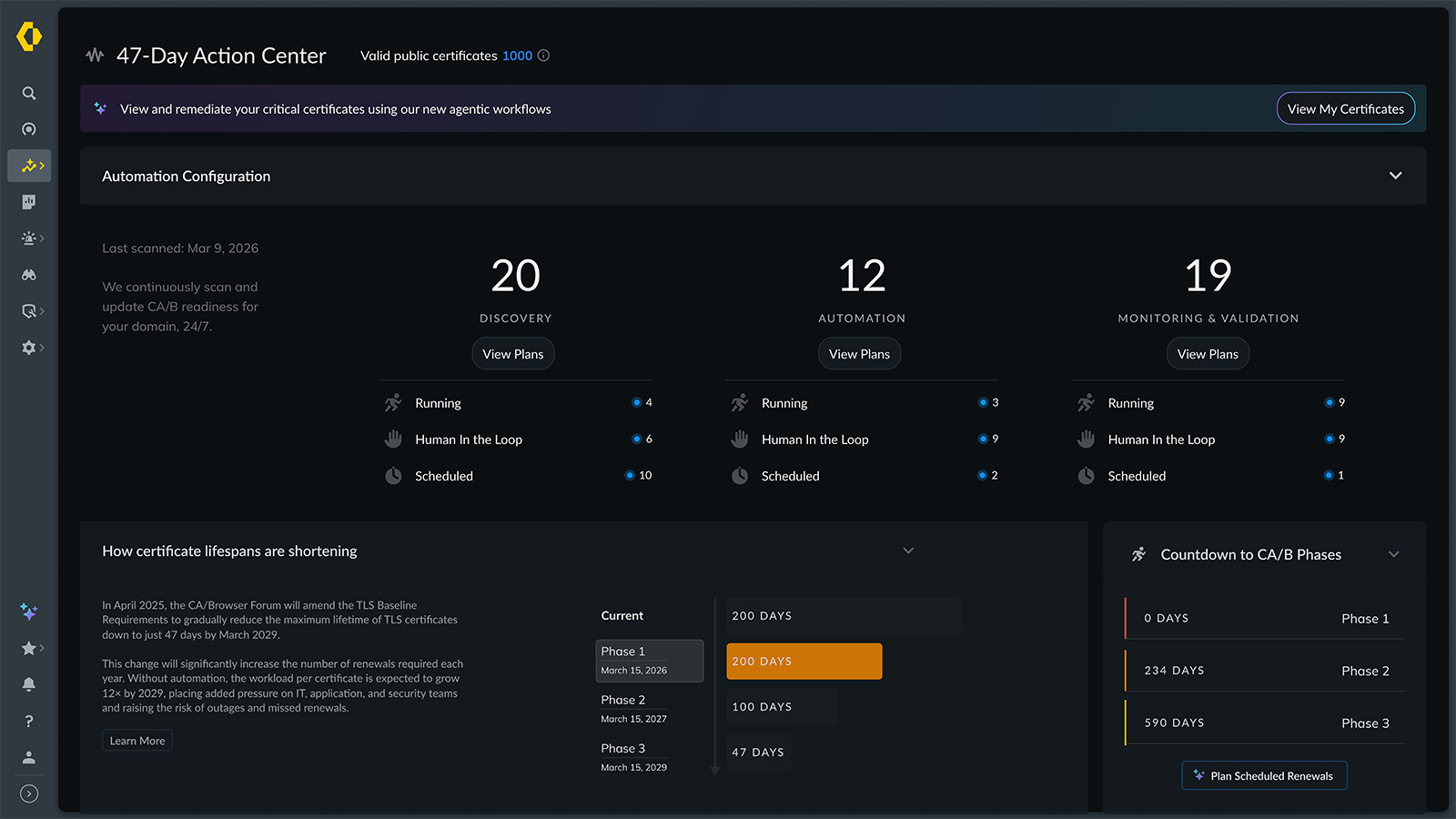 Gain unified visibility into public and private certificates across firewalls, remote access gateways, workloads, Kubernetes clusters and internal systems. Identify ownership, expiration status, issuing authority and policy alignment from a single authoritative inventory.