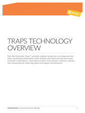 Palo Alto Networks® Traps™ advanced endpoint protection stops threats on the endpoint and coordinates enforcement with cloud and network security to prevent successful cyberattacks. Traps minimizes endpoint infections by blocking malware, exploits and ransomware. Integration with your security platform delivers additional threat analysis, shared intelligence and automated containment.