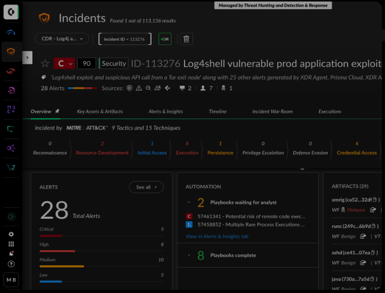 Automated correlation turns fragmented alerts into high-fidelity incidents, accelerating investigations and reducing response time. With over 1,000 prebuilt playbooks and automated remediation, security teams can contain threats at their source—before they escalate.