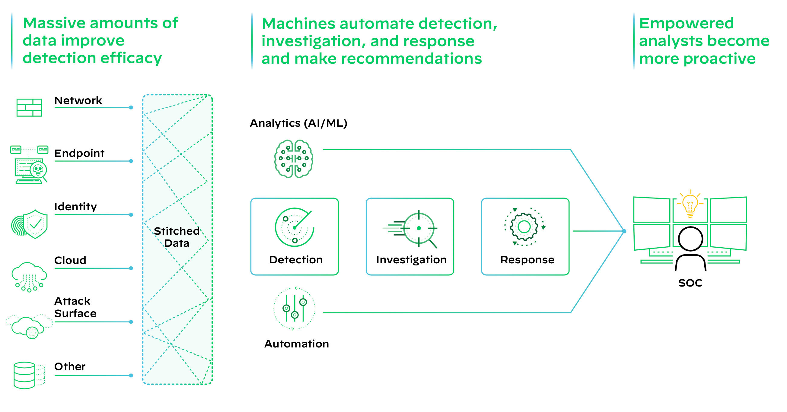 Integrates endpoint, cloud, network, and third-party telemetry for automated detection and response.