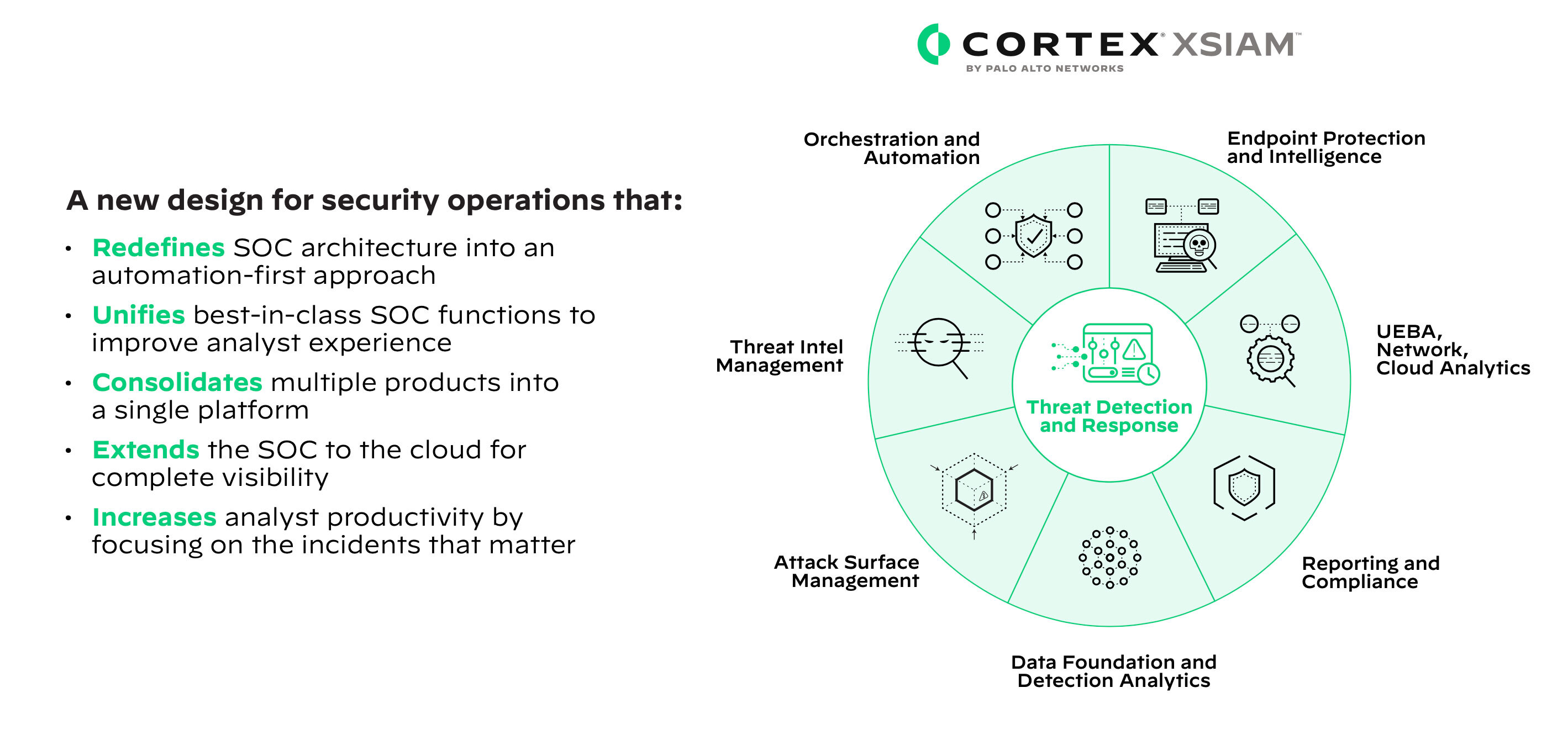 Cortex XSIAM is the AI-driven security operations platform for the modern SOC, harnessing the power of artificial intelligence and automation to simplify security operations, stop threats at scale, and accelerate incident remediation. Reduce risk and operational complexity by converging multiple products into a single, coherent platform purpose-built for security operations.
